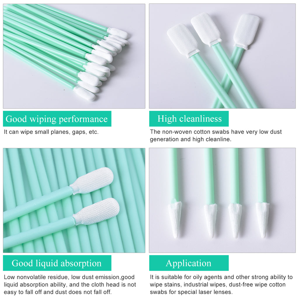 The swab tip is generally made of dust-free non-woven fabric, with fibers that are not easy to shed and will not scratch the lens coating.